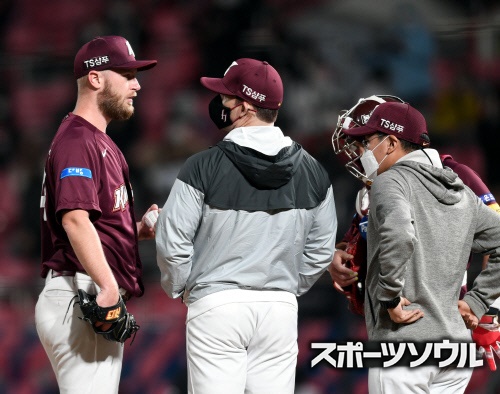 2回に失点した後、マウンドを訪れたコーチの話を聞いているキウム先発投手ヨキシュ