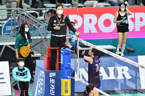 (写真提供=KOVO)11月11日の試合でのカン・ジュヒ主審とキム・ヨンギョン(10番)