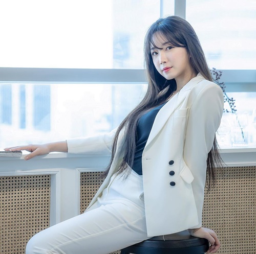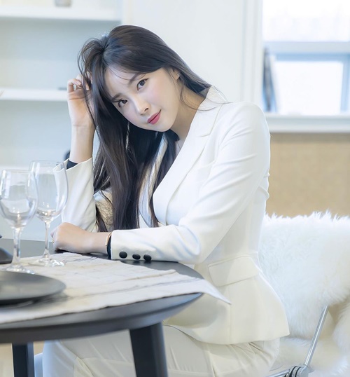 写真を見ると、上下白スーツを華麗に着こなすアン・ジヒョンの姿が写っている。チアリーダーとして活動しているだけあって、整ったルックスとパーフェクトなボディラインが見る者を魅了させた。