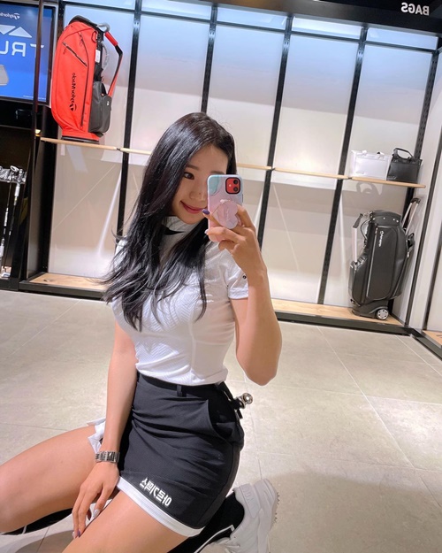 写真を見ると、上が白、下が黒のゴルフウェアを着用したユ・ヒョンジュが、鏡越しに自撮りをしている。タイトなウェアから伝わるメリハリあるボディやミニスカートからスラリと伸びた美脚はさることながら、普段見慣れない黒髪が見た者の多くを虜にしてみせた。
