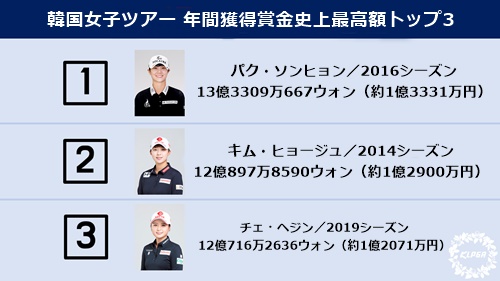 なお、2020シーズンの韓国女子ツアーでは、7億9713万7207ウォン(約7971万円)を獲得したキム・ヒョージュが賞金王に輝いた。