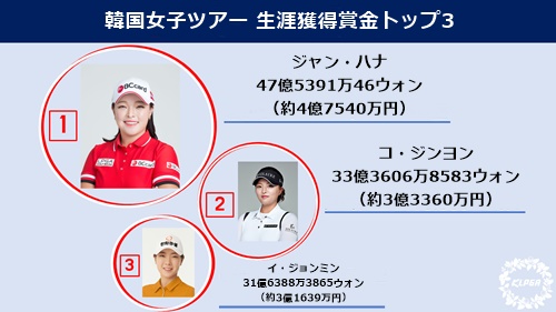 そこで今回は、韓国女子プロゴルフ協会(KLPGA)の発表を基に、韓国女子ツアーにおける生涯獲得賞金のトップ3を発表しよう。