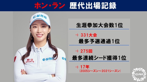 “生涯参加大会数”を見るとホン・ラン以下は2位ユン・スラ(35)、3位キム・ボギョン(34)、4位パク・ユナ(33)となっているが、いずれの選手も今シーズンは正規ツアーで活動しないため、ホン・ランの出場記録を上回ることは難しいものと見られている。