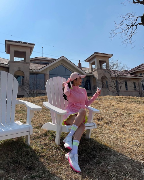 写真を見ると、ピンク色のゴルフウェアに身を包んだアン・シネが白色のウッドチェアに座り、足を組んで優雅な雰囲気を漂わせている。特に、ミニスカートからスラリと伸びた美脚が多くのファンの目を惹きつけていた。
