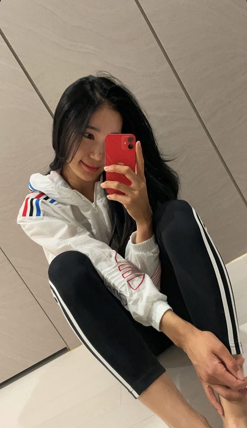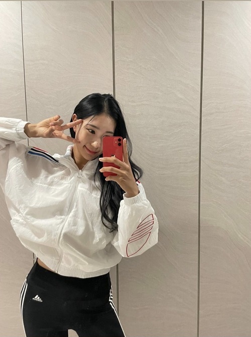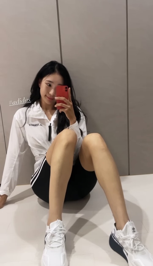 「#adidas」のハッシュタグが付けられた写真たちを見ると、ユ・ヒョンジュが上下ウェアからシューズまですべてアディダスの製品に身を包み、鏡越しに自撮りをしている。
