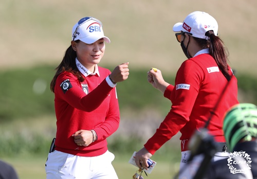 (写真提供=KLPGA)優勝決定後、ジャン・ハナ(右)と健闘をたたえ合うイ・ソミ