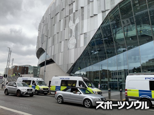 万が一の事態に備え、スタジアム周辺には警察関係車両も配置されていた。以前には見られなかった光景だ。