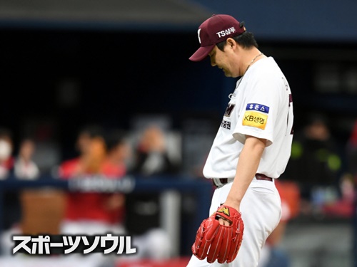 四球を許し肩を落とすキウム・ヒーローズのキム・テフン