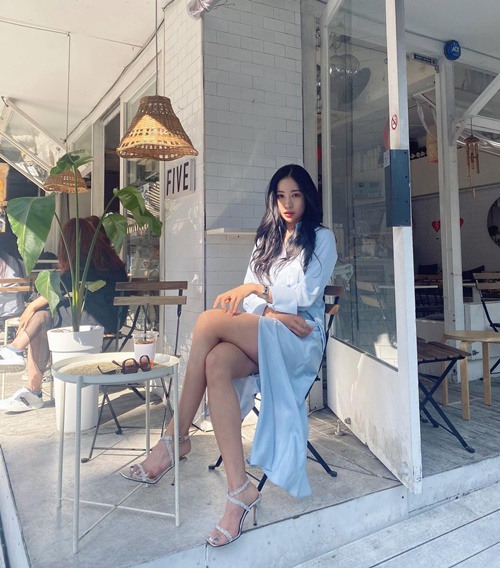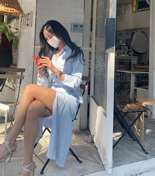 投稿を見ると、スリット入りのワンピース姿で脚を組んで座るユ・ヒョンジュが写っている。何より目を引くのはそのレッグラインで、スラリと伸びる脚線美が見た者の多くを魅了して見せた。