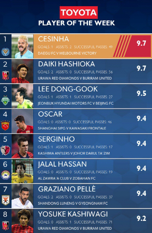 韓国の大邱FCセシーニャと全北現代イ・ドングッが、アジアサッカー連盟(AFC)チャンピオンズリーグ(ACL)「今週の選手」上位に入った。
