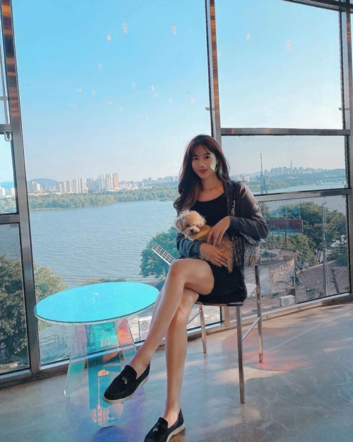 写真に写っているのは、足を組んで椅子に座る私服姿のキム・ハンナ。遠目からでも伝わるルックスの良さはさることながら、ミニスカートからスラリと伸びた美脚が見た者の目を引く。