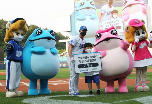 サムスンはオ・スンファンの300セーブ達成が間近に迫った去る4月15日から、NAVERのハッピービーンを通じて300セーブ達成記念の寄付金募集を開始。そして今回、ファンが集めた寄付金約300万ウォン(日本円=約30万円)に加え、オ・スンファン自ら出した300万ウォン、ハイトジンロからの寄付金300万ウォンを合わせた計900万ウォン(約90万円)の寄付金が伝達された。