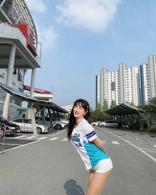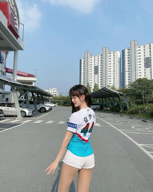 写真を見ると、自身がチアリーダーを務めるKIAタイガースの本拠地、KIAチャンピオンズフィールドの外でカメラに向かってポーズを決めるキム・ハンナが写っている。ユニホーム姿でも伝わるスタイルの良さはさることながら、ホットパンツからスラリと伸びた美脚が印象的で、見た者の多くを虜にしてみせた。