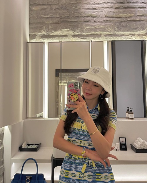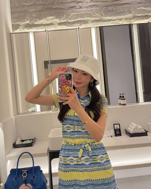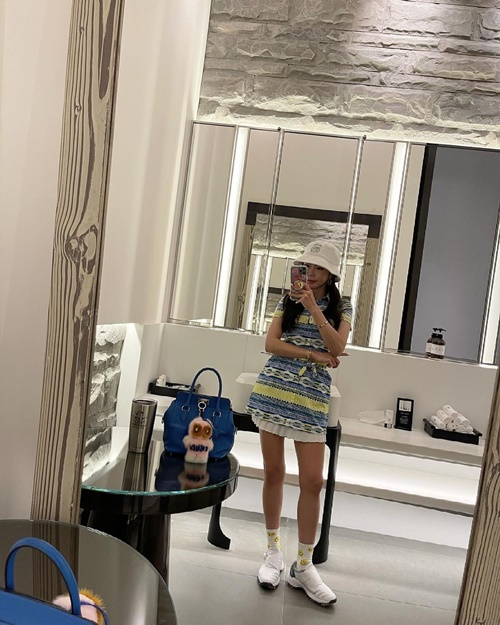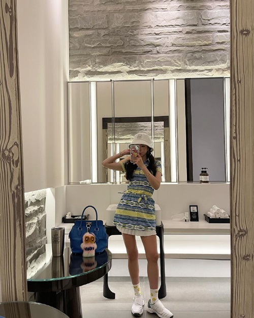 写真を見ると、白のバケットハットを被ったアン・シネが黄色と水色を基調としたワンピースのゴルフウェアに身を包み、鏡越しに自撮りを披露している。夏らしく爽快感が感じられるコーディネートはさることながら、ワンピースからスラリと伸びた美脚が見た者を魅了させた。