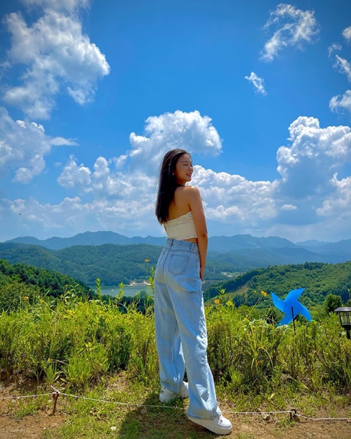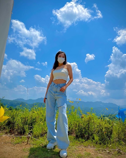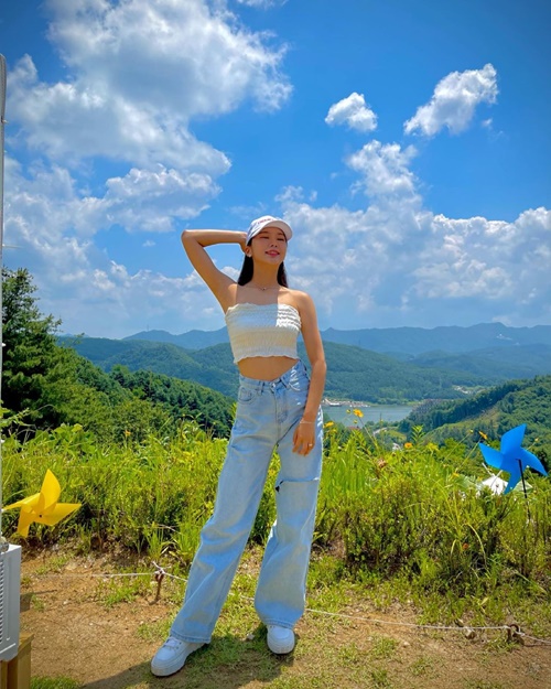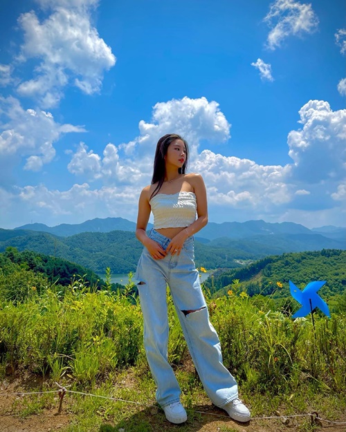 写真を見ると、青空広がる自然をバックにポーズを披露するイ・ジュアの姿が写っている。白色のチューブトップにデニムを合わせたコーディネートで、チアリーダーらしく引き締まったスタイルが印象的だ。