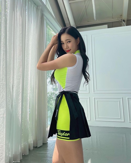 写真を見ると、テーラーメイドゴルフのウェアを着用したユ・ヒョンジュが写っている。モデルのような整った顔立ちはさることながら、タイトなノースリーブから伝わる美スタイルが見た者を魅了した。