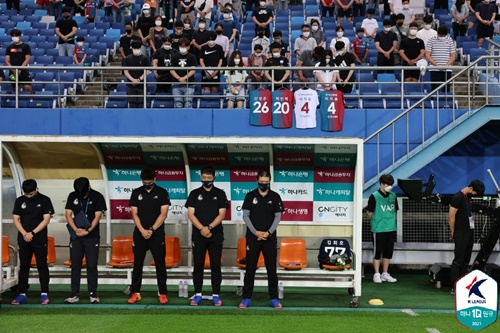 (写真提供=韓国プロサッカー連盟)黙祷をささげるソウルイーランドのコーチ陣