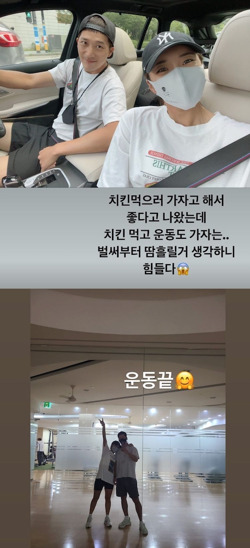 イ・ボミは8月11日、インスタグラムのストーリーに「チキン食べに行こうというから喜んでついて来たのに、チキン食べてから運動しに行こうと…汗をかくと思うと今から疲れる」という文章を添え、夫婦のツーショットを公開した。