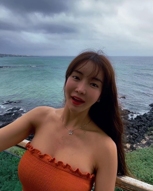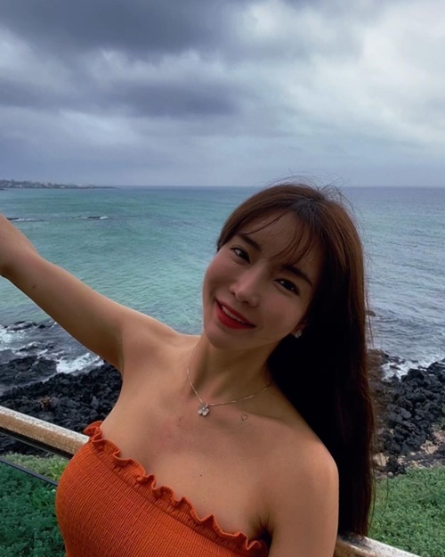 写真を見ると、海をバックに自撮りをするチューブトップ姿のアン・シネが写っている。空は厚い雲に覆われていたものの、韓国屈指のリゾート地である済州島で束の間の休日を楽しんだ模様だ。