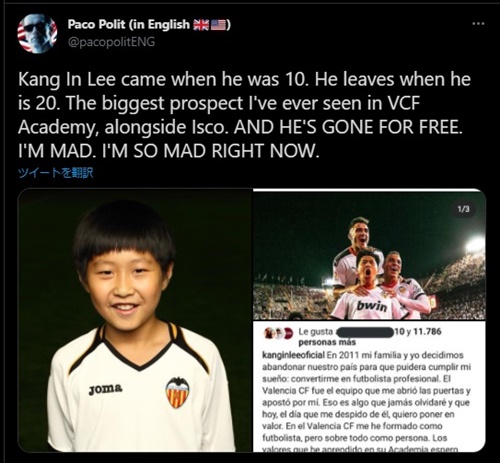 サッカージャーナリストのPaco Polit氏はツイッターに、「イ・ガンインは10歳の時にバレンシアへ来て、20歳の時に去った。彼はバレンシアのユースチーム史上、イスコ(レアル・マドリード)と並んで、私が見た最高の有望株だった。しかし、彼はタダで出て行った。私は本当に腹が立つ」と投稿しており、ほとんどのファンも同意している。