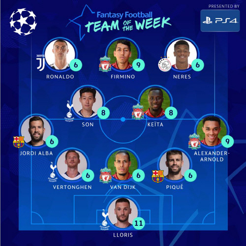 UEFAは4月12日(日本時間)、2018-2019シーズンのチャンピオンズリーグ準々決勝・第1戦の結果をもとにした「今週のチーム」を発表した。3-4-3フォーメーションのベストイレブンで、ソン・フンミンはMFとして選ばれた。