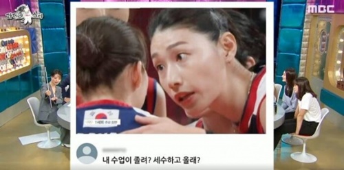 番組途中、MCのアン・ヨンミは一枚の写真を取り上げた。それは、キム・ヨンギョンが試合中にチームメイトに顔を近づけ、やや興奮した風に語りかけている様子の写真だ。この写真は日本で“大喜利”写真として話題を集め、「怒らないから正直に言ってみて」「私の授業眠い?顔洗ってくる?」など、多彩なコメントが付けられていた。