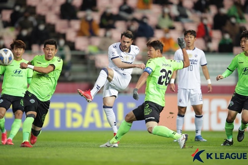 両チームは観る者に最後まで手に汗を握らせた。試合終了直前にはブラジル人FWグスタヴォ(27、全北現代)がゴール前でシュートを放つもポストの脇に外れ、スタジアムは沈痛した。