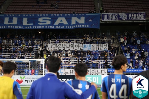 ホームの蔚山現代は水原FCに3-2で勝利。試合後、選手とコーチ陣は勝利記念写真を撮るべく、サポーター集団チョヨンチョンサのいるS席に向かって歩いて行った。