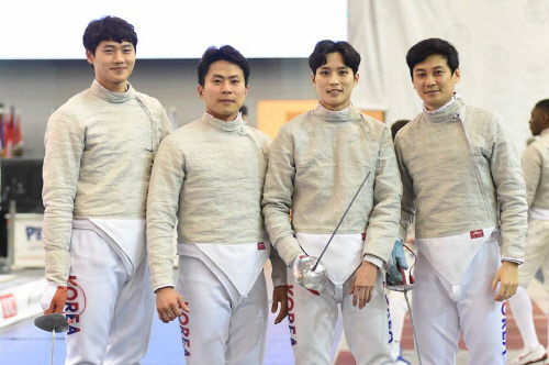 (写真提供=韓国フェンシング協会)サーブル男子代表チーム。左からオ・サンウク、キム・ゲファン、キム・ジュンホ、ク・ボンギル