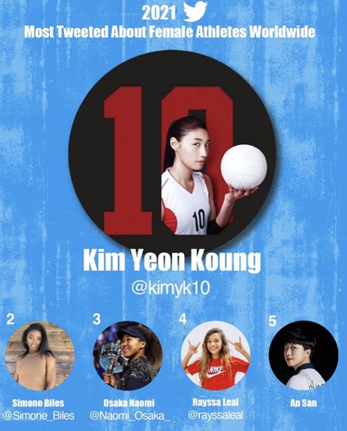 12月10日、ツイッターは「2021年世界で最もツイートが多かった女性アスリート」のリストを公開。現在、中国リーグで活躍しているバレーボール選手のキム・ヨンギョンが1位に選ばれた。この結果にキム・ヨンギョンは、17日に自身のツイッターで「Thank you so much」とつぶやき、感謝を示した。
