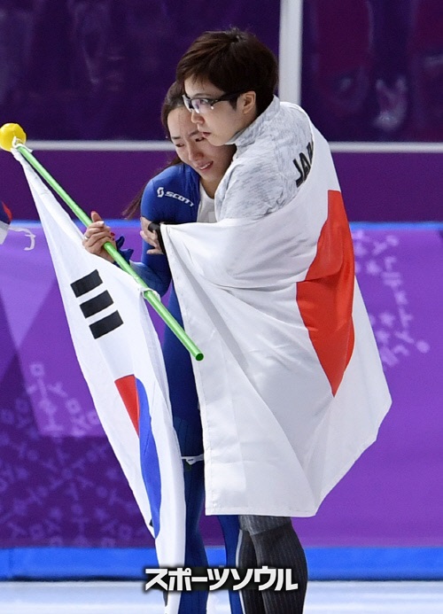 2018年2月18日、江陵スピードスケート競技場で開かれた平昌五輪の女子500mで銀メダルを取ったイ・サンファ(左)を金メダリスト小平奈緒が抱擁している