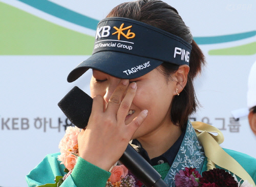チョン・インジは最終18番ホール(パー5)をパーで終えた後、明るい笑顔で優勝の喜びを表した。しかし、これまでの気苦労が思い出されたのか、涙ぐんだ。止めどなく溢れ出る涙に、言葉を続けられなかった。