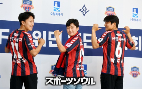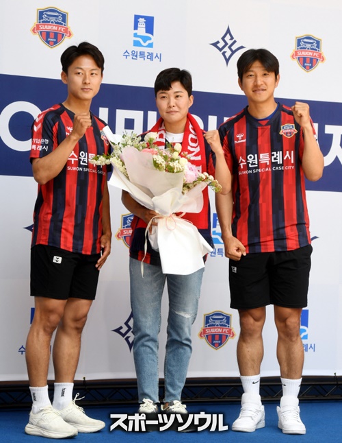 パク・チュホは笑顔でチ・ソヨンに水原FCのマフラーをかけ、イ・スンウもチ・ソヨンの入団を祝福した。