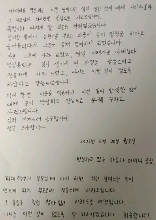 結局、水原三星のサポーター団体「FRENTE TRICOLOR(フレンテ・トリコロール)」は21日、公式SNSを通じて謝罪文とともに、加害者本人、加害者の母親の直筆の謝罪文を掲載した。