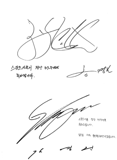 『スポーツソウル』創刊37周年を記念して贈られた2人のサイン。上がホン・ミョンボ監督、下がキム・ヨングォン
