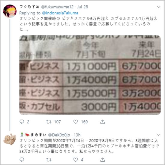 ある日本ネットユーザーは、当該書き込みを見た後、直接日本に3週間泊まることになる場合の宿泊費を計算したりもした。彼の計算によると、ボランティアが3週間前に現地に到着してオリンピックを終えるまで、カプセルホテルに宿泊するなら、約53万円がかかるという。