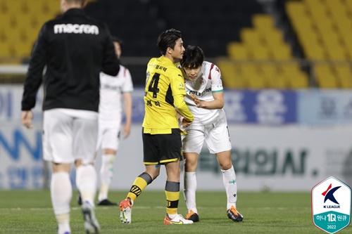 (写真提供=韓国プロサッカー連盟)全南の佐藤優平と挨拶する石田雅俊