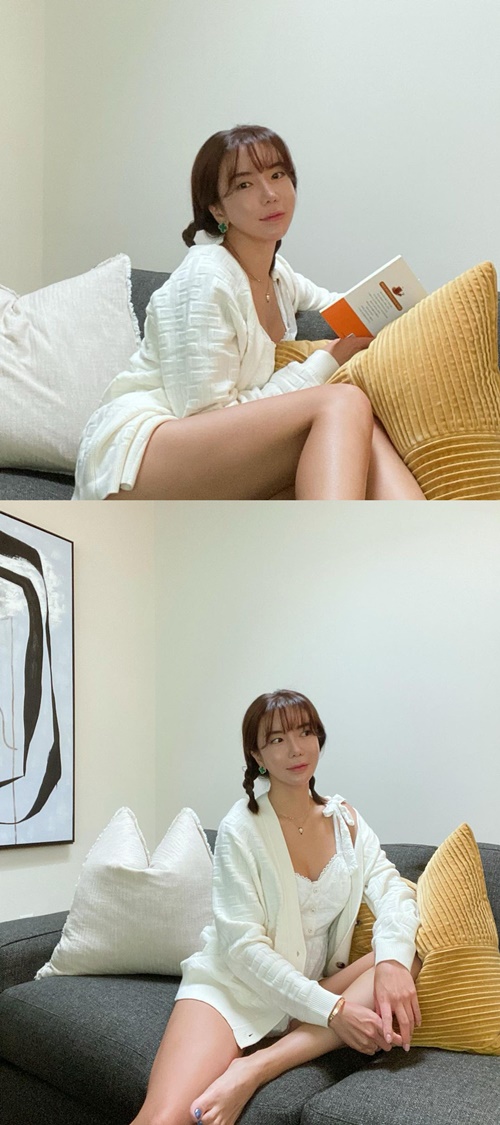 写真を見ると、レースのキャミソールにカーディガンを羽織ったアン・シネが、ソファーでくつろいでいる様子が写っている。何気ない写真ながらも、整えられたルックスが見る者の目を引いた。