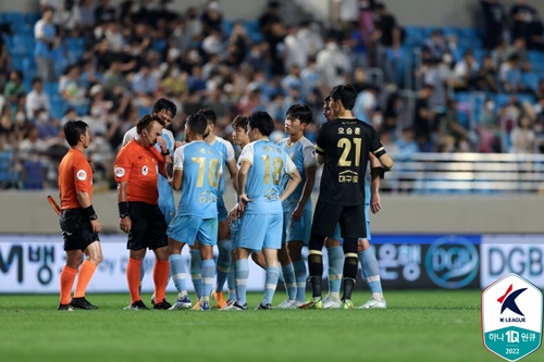 7月31日の第25節水原FC戦では、後半途中に相手の退場で数的優位に立ち、終了間際まで大邱FCが2-1とリードしていた。にもかかわらず、後半ロスタイムにDFキム・ウソク(26)が一発退場のファウルでPKを与えてしまい、同点に追いつかれてしまった。