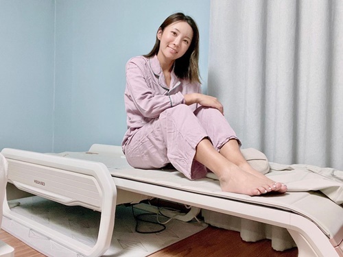 写真を見ると、イ・ボミが健康器具メーカー「CERAGEM」のマッサージベッド「MASTER V6」の上に座り、カメラに笑顔を見せている。