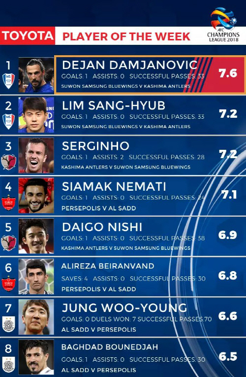 アジア・チャンピオンズリーグ(ACL)決勝進出に失敗した韓国Kリーグ・水原三星ブルーウィングスのFWデヤン・ダムヤノビッチが、アジアサッカー連盟(AFC)が選定した“今週の選手”(PLAYER OF THE WEEK)に選ばれた。