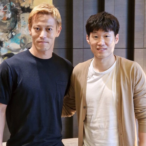 「韓日サッカー首脳会談(笑) パク・チソン委員と本田圭佑監督が遭遇しました」とキャプションに綴り、2枚の写真を投稿した。