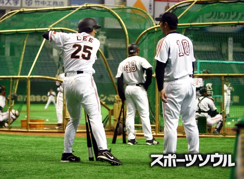 2007年3月、ジャイアンツ時代のイ・スンヨプ(左)が阿部と打撃について会話をしている