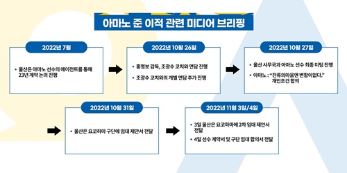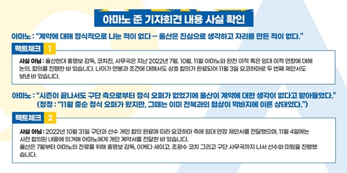 事実ではない:2022年10月31日、クラブと選手個人の合意完了により、横浜側にレンタル延長提案書を伝達し、11月4日には事前合意した内容に基づき天野に個人契約書を伝達している。蔚山は7月から天野の残留のためにホン・ミョンボ監督、池田誠剛コーチ、チョ・グァンス・コーチ、そしてクラブ事務局などが選手とミーティングを実施してきた。