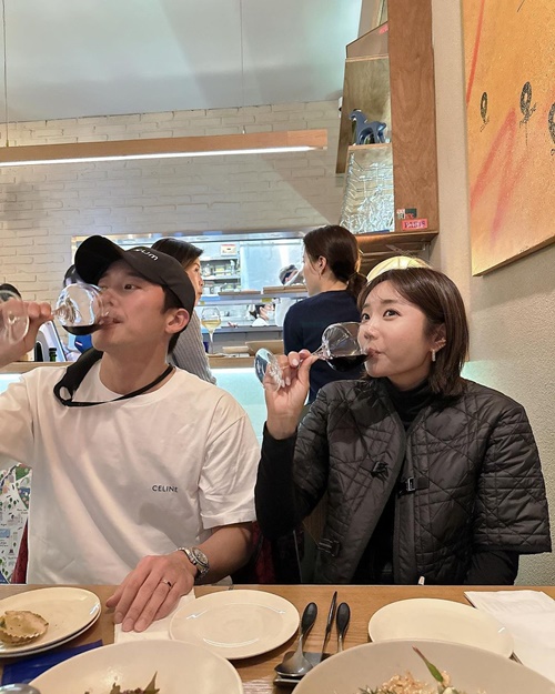 隣に座っているのは夫で俳優のイ・ワン。2人仲良く赤ワインを飲む姿が愛くるしいのはさることながら、夫婦の“美男美女”ぶりが際立つツーショットが見る者の目を引いた。