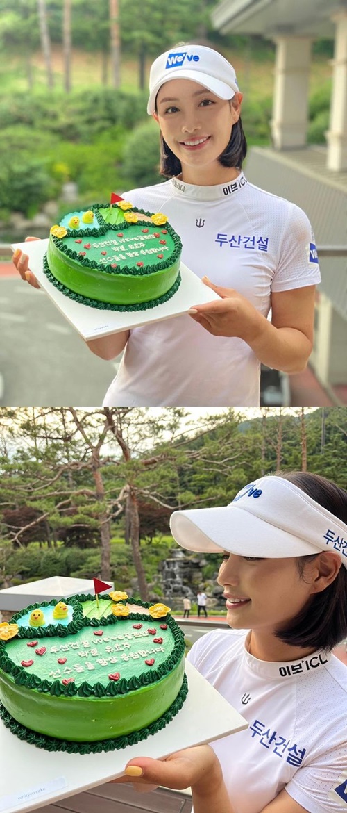 ちなみに、ゴルフ場を模して緑色を基調に彩られたケーキには、「斗山建設We'Veゴルフ団 パク・キョル、ユ・ヒョジュ選手をいつも応援します」との応援メッセージが綴られていた。