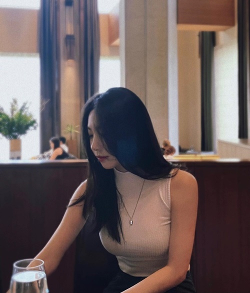 写真を見ると、カフェと思しき店内でくつろぐ様子のチェ・ダビンが写っている。セミロングの黒髪を胸元まで垂らし、タイト目なノースリーブを着用している。
