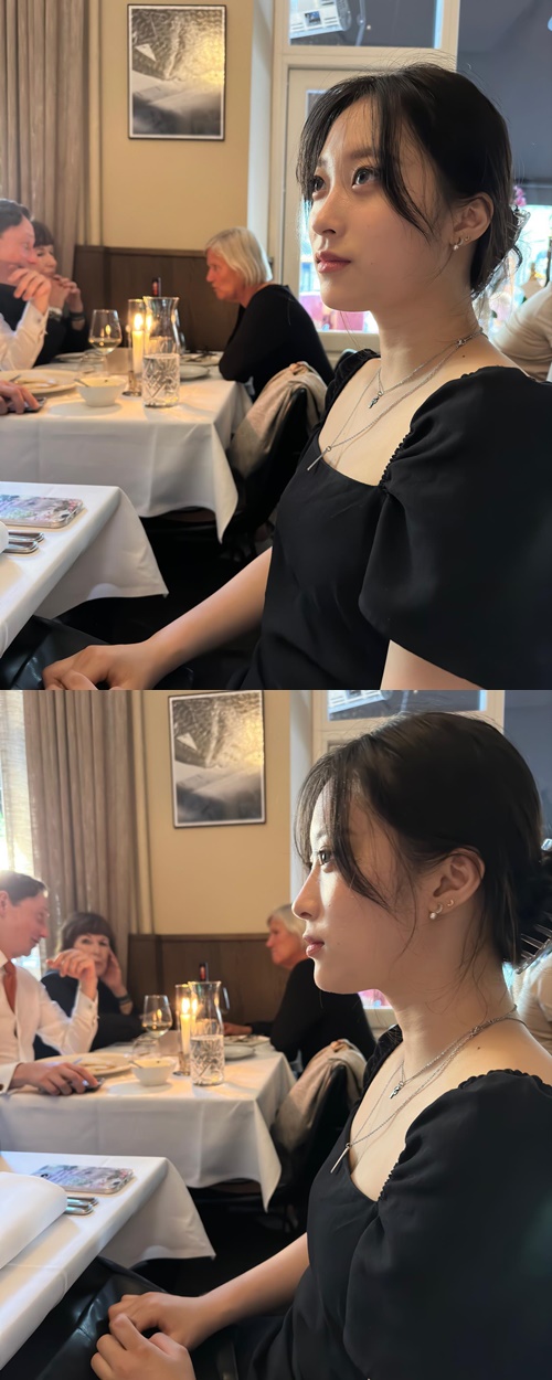 写真を見ると、黒色の半袖パフスリーブ姿のユ・ヨンが、レストランと思しき店内で何気ない表情を見せている。