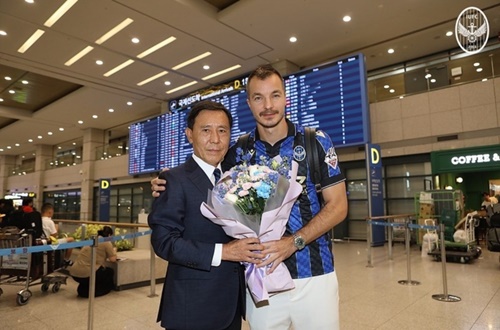 空港に到着したムゴシャは、ポロシャツを脱いで中に着ていた仁川のホームユニホーム姿を披露すると、カメラに向かって満面の笑みでポーズを見せた。国内初の“空港オフィシャル”に、仁川のファンは熱い反応を寄せていた。