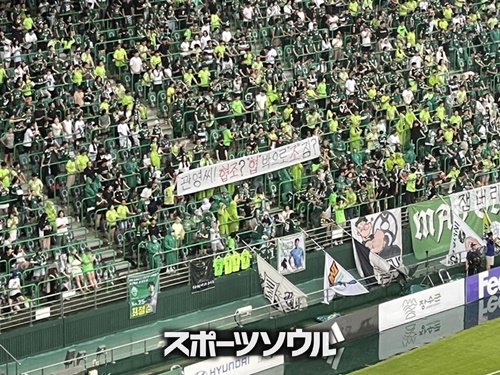 抗議の横断幕を掲げる全北現代サポーター